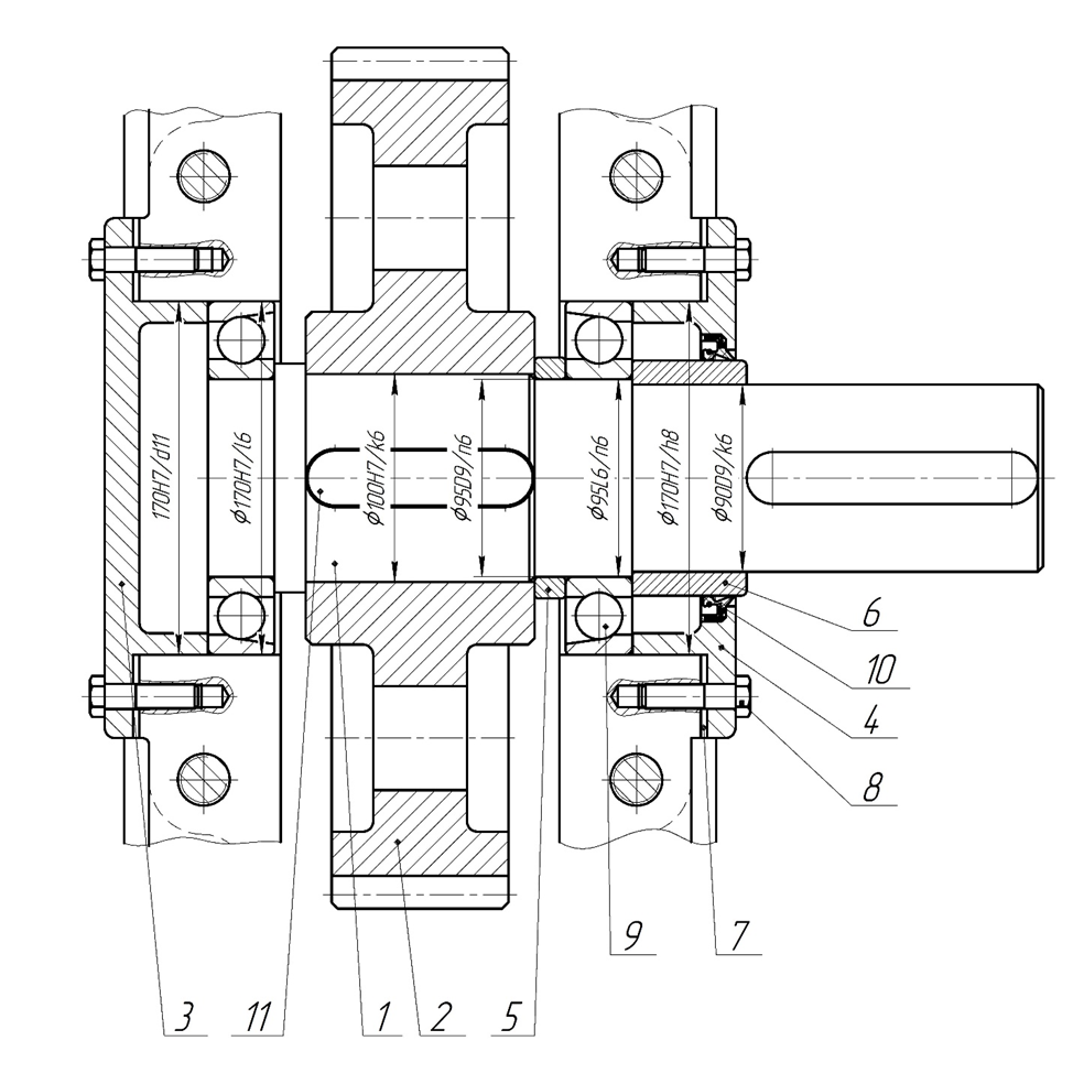 Колесо на валу крепится при помощи шпоночного соединения и переходной посадки на цилиндрической поверхности, с левой стороны оно фиксируется от осевого смещения упорным буртиком и базируется по цилиндрической поверхности, с правой стороны от осевого смещения колесо фиксируется дистанционным кольцом, базирующимся по торцу, которое в свою очередь упирается во внутреннее кольцо подшипника. Для фиксации наружных колец подшипников в расточки подшипниковых окон редуктора вставляются торцовые крышки, базирующиеся по торцу окна, и крепятся винтами. Для регулировки зазора между телами качения и беговыми дорожками подшипников предусмотрен набор прокладок под торцовые крышки. Регулировка осуществляется подшлифовкой прокладок.