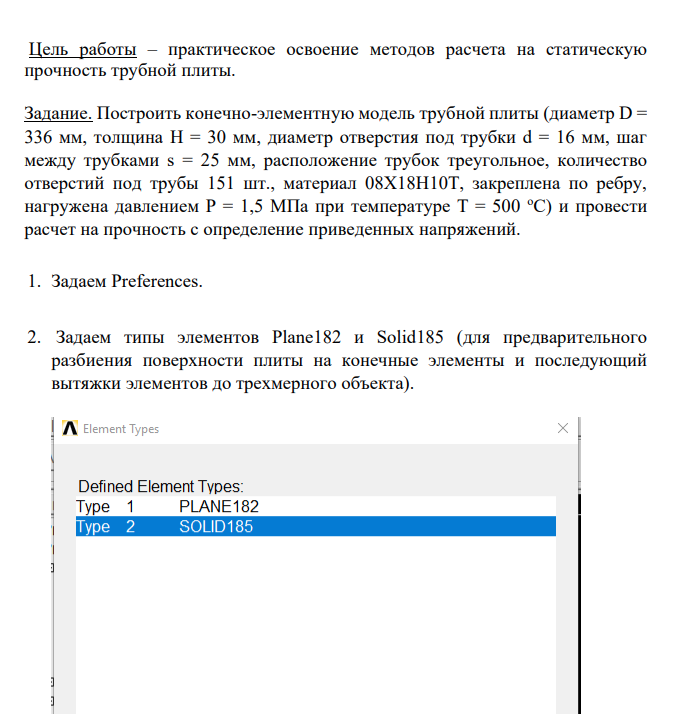 Построить конечно-элементную модель трубной плиты (диаметр D = 336 мм, толщина H = 30 мм, диаметр отверстия под трубки d = 16 мм, шаг между трубками s = 25 мм, расположение трубок треугольное, количество отверстий под трубы 151 шт., материал 08Х18Н10Т, закреплена по ребру, нагружена давлением P = 1,5 МПа при температуре T = 500 оС) и провести расчет на прочность с определение приведенных напряжений.