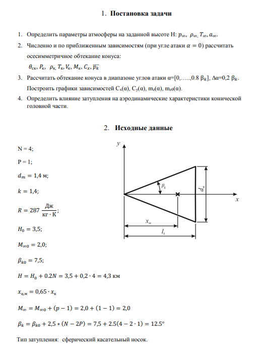 Для студентов МГТУ им. Н.Э.Баумана по предмету Аэродинамика ракет и транспортных системРасчёт аэродинамических характеристик конуса в сверхзвуковом потокеРасчёт аэродинамических характеристик конуса в сверхзвуковом потоке