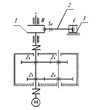 Вращательное движение от асинхронного электродвигателя передаётся через муфту на входной вал цилиндрического двухступенчатого соосного зубчатого редуктора. Первая ступень, называемая быстроходной, образована шестерней с числом зубьев Z1 и колесом с числом зубьев Z2 на промежуточном валу. Вторая ступень (тихоходная) образована шестерней на промежуточном валу с числом зубьев Z3 и колесом с числом зубьев Z4, смонтированным на выходном валу редуктора (Рис. 1).