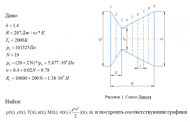 Требуется рассчитать параметры газа, истекающего из емкости через сопло Лаваля, имеющее коническую форму и геометрические размеры (рис. 1) Известны также давление p0 и температура T0 торможения, число Маха на срезе сопла, соотношение удельных теплоемкостей k и постоянная R. Исходные данные приведены на рис. 1. По результатам вычислений построить графики изменения давления, температуры, плотности, скорости звука, скорости течения газа, числа Маха по длине сопла, а также определить секундный массовый расход и режим работы сопла. Давление в среде, куда проиходит истечение, стандартное, pн = 10^5 Па
