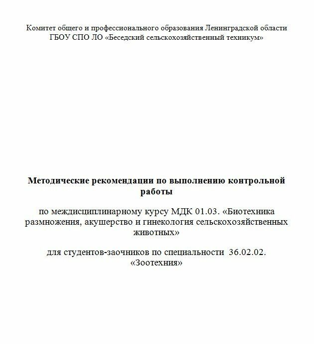 Методические рекомендации по выполнению контрольной работы по междисциплинарному курсу МДК 01.03. «Биотехника размножения, акушерство и гинекология сельскохозяйственных животных»