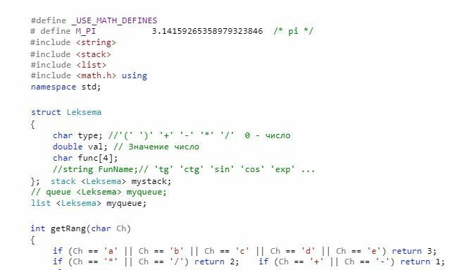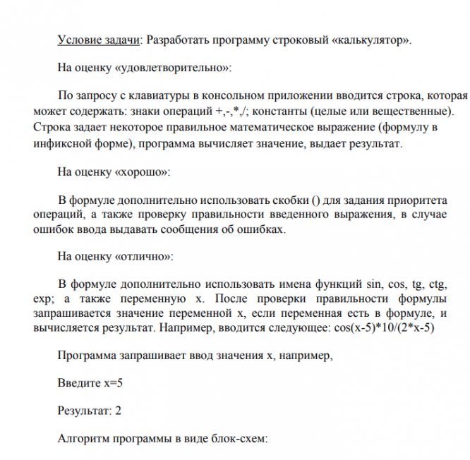 На оценку «удовлетворительно»: По запросу с клавиатуры в консольном приложении вводится строка, которая может содержать: знаки операций +,-,*,/; константы (целые или вещественные). Строка задает некоторое правильное математическое выражение (формулу в инфиксной форме), программа вычисляет значение, выдает результат. На оценку «хорошо»: В формуле дополнительно использовать скобки () для задания приоритета операций, а также проверку правильности введенного выражения, в случае ошибок ввода выдавать сообщения об ошибках. На оценку «отлично»: В формуле дополнительно использовать имена функций sin, cos, tg, ctg, exp; а также переменную x. После проверки правильности формулы запрашивается значение переменной x, если переменная есть в формуле, и вычисляется результат. Например, вводится следующее: cos(x-5)*10/(2*x-5) Программа запрашивает ввод значения x, например, Введите x=5 Результат: 2 Алгоритм программы в виде блок-схем: