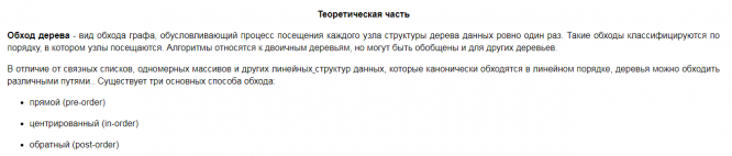 Рекурсивные алгоритмы Обход дерева - вид обхода графа, обусловливающий процесс посещения каждого узла структуры дерева данных ровно один раз. Такие обходы классифицируются по порядку, в котором узлы посещаются. Алгоритмы относятся к двоичным деревьям, но могут быть обобщены и для других деревьев. В отличие от связных списков, одномерных массивов и других линейных структур данных, которые канонически обходятся в линейном порядке, деревья можно обходить различными путями.. Существует три основных способа обхода: прямой (pre-order) центрированный (in-order) обратный (post-order) .