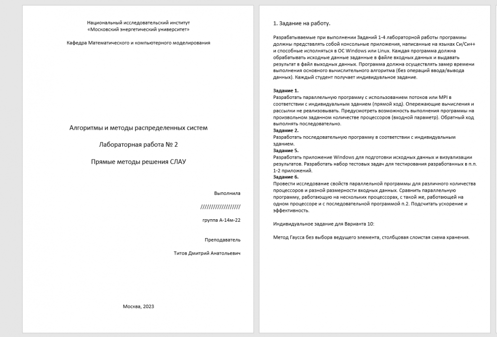Разработать параллельную программу с использованием потоков или MPI в соответствии с индивидуальным зданием (прямой ход). Опережающие вычисления и рассылки не реализовывать. Предусмотреть возможность выполнения программы на произвольном заданном количестве процессоров (входной параметр). Обратный ход выполнять последовательно.