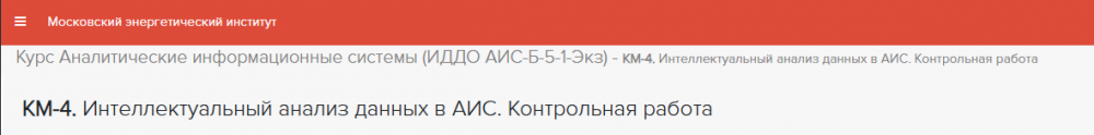 Для студентов ИДДО НИУ «МЭИ» по предмету Аналитические информационные системыПомощь с выполнением - КМ-4. Интеллектуальный анализ данных в АИС. Контрольная работаПомощь с выполнением - КМ-4. Интеллектуальный анализ данных в АИС. Контрольная работа