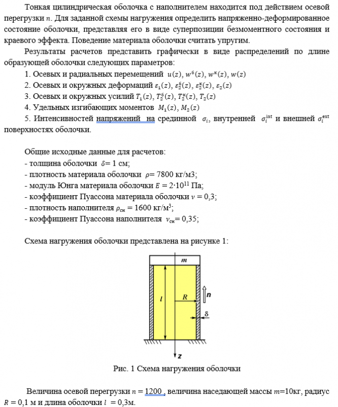 Для студентов МГТУ им. Н.Э.Баумана по предмету Аналитические методы решения задач МССРасчет напряженно-деформированного состояния тонкой цилиндрической оболочки с наполнителем под действием осевой перегрузкиРасчет напряженно-деформированного состояния тонкой цилиндрической оболочки с наполнителем под действием осевой перегрузки
