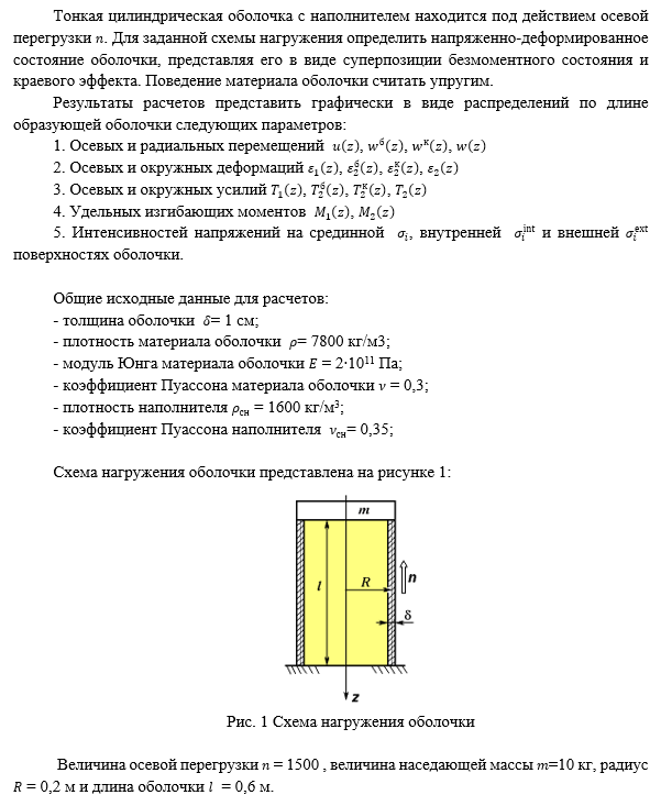 Для студентов МГТУ им. Н.Э.Баумана по предмету Аналитические методы решения задач МССРасчет напряженно-деформированного состояния тонкой цилиндрической оболочки с наполнителем под действием осевой перегрузкиРасчет напряженно-деформированного состояния тонкой цилиндрической оболочки с наполнителем под действием осевой перегрузки