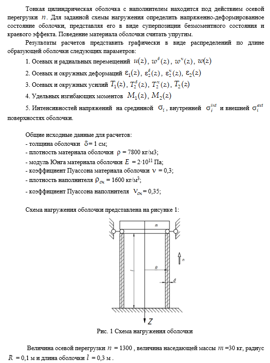 Для студентов МГТУ им. Н.Э.Баумана по предмету Аналитические методы решения задач МССРасчет напряженно-деформированного состояния тонкой цилиндрической оболочки с наполнителем под действием осевой перегрузкиРасчет напряженно-деформированного состояния тонкой цилиндрической оболочки с наполнителем под действием осевой перегрузки