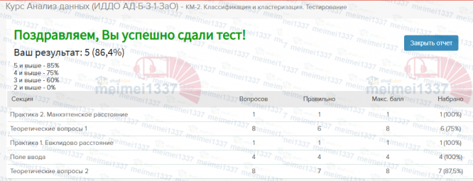 Для студентов ИДДО НИУ «МЭИ» по предмету Анализ данныхКМ-2. Классификация и кластеризация. Тестирование - 86.4%КМ-2. Классификация и кластеризация. Тестирование - 86.4%
