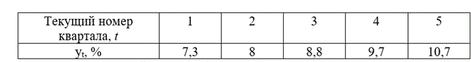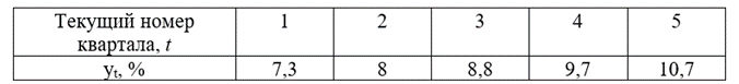 Прогноз процентной ставки банка в шестом квартале, рассчитанный с помощью среднего абсолютного прироста, составляет …