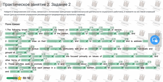 Готовые работы и услуги для НСПК, ОСЭК  Найдите в предложениях все слова, связанные с этическими принципами профессиональной деятельности социального работника, и нажмите на них левой клавишей мыши (для выполнения упражнения рекомендуется предварительно выполнить перевод). The following broad ___ are based on ___ of service, ___ and ___of the person ,and ___. ___ draw on their ___ and ___ to ___ and to address ___ pursue ___ particularly with and on ___ of___ and ___ individuals and groups of ___ ___ are focused primarily on issues of ___ and other forms of ___ These activities seek to promote ___ to and ___ about ___ and ___ and ___ treat each person in a and ___ fashion, ___ of ___ and ___.