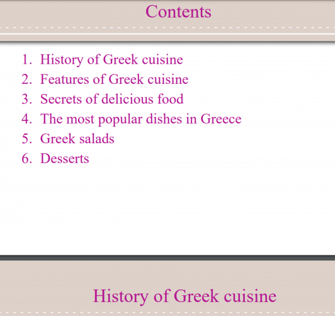 Презентация на 8 слайдов (по гост, с картинками) на тему "Greek cuisine"