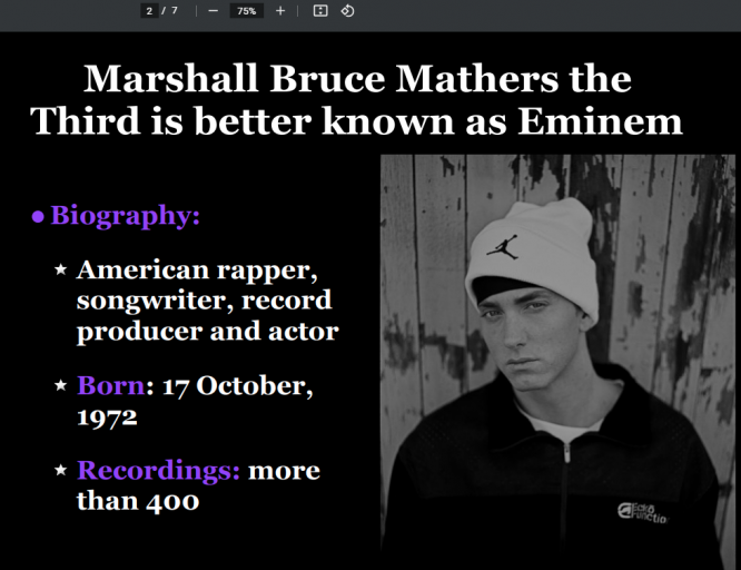 Презентация на 7 слайдов (по гост, с картинками) на тему "Eminem"