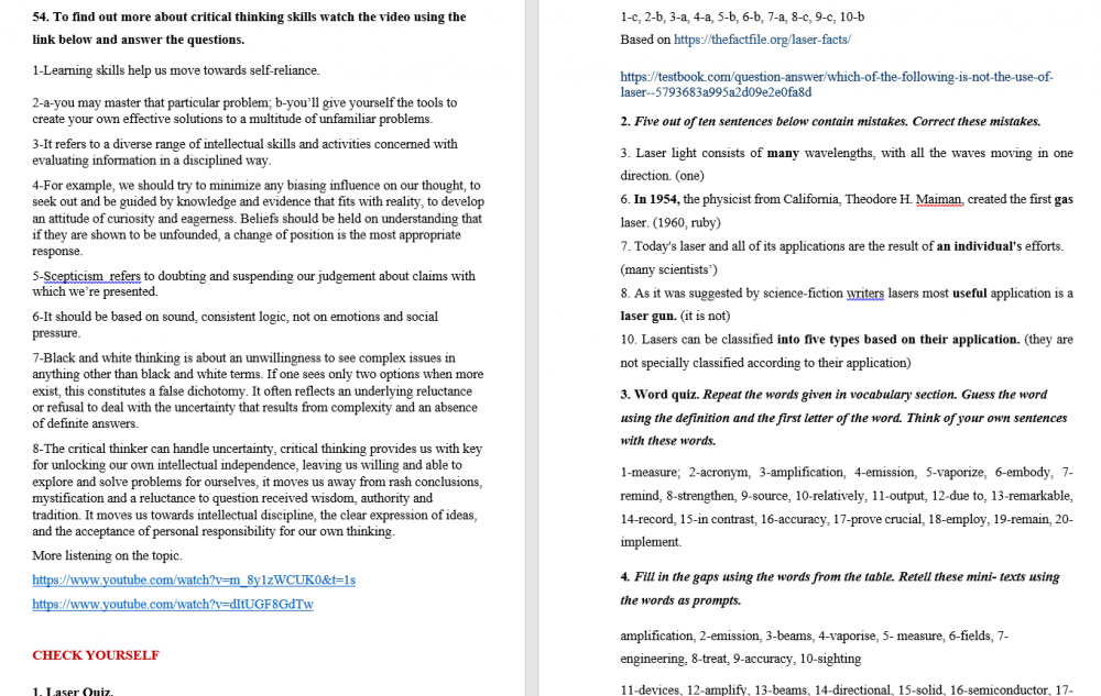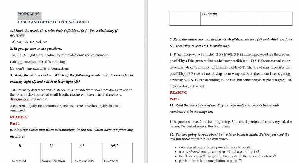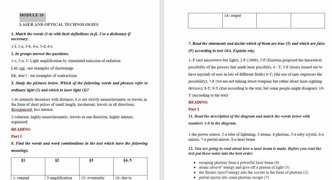 1- F (not microwave but light); 2-F (1960); 3-F (Einstein proposed the theoretical possibility of the process that made laser possible); 4 - T; 5-F (lasers turned out to have myriads of uses in lots of different fields) 6-T; (the use of may expresses the possibility); 7-F (we are not talking about weapons but rather about laser-sighting devices); 8-T; 9-T (true according to the text, but some people might disagree); 10-T (according to the text)