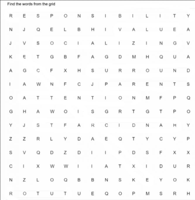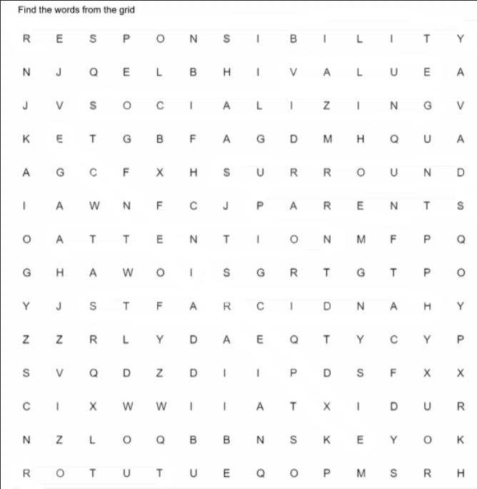 Найдите слова, связанные с профессией воспитателя/учителя в таблице ниже.