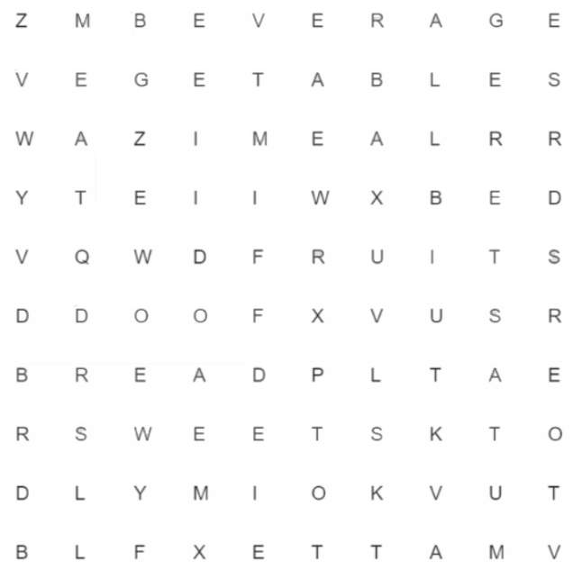 Найдите слова, по теме «Еда» в таблице ниже.