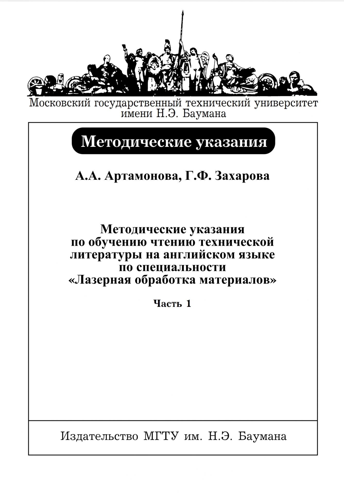 Артамонова А.А., Захарова Г.Ф. Методические указания по обучению чтению технической литературы на английском языке по специальности «Лазерная обработка материалов». Ч. 1. – М.: Изд-во МГТУ им. Н.Э. Баумана, – 2002. – 26 с. - ISBN 5-7038-2050-2..