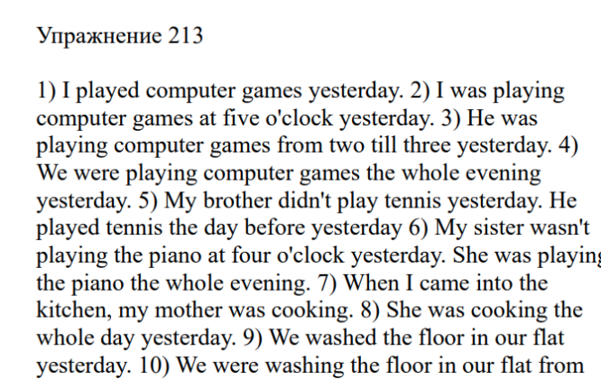 1) I played computer games yesterday. 2) I was playing computer games at five o'clock yesterday. 3) He was playing computer games from two till three yesterday. 4) We were playing computer games the whole evening yesterday. 5) My brother didn't play tennis yesterday. He played tennis the day before yesterday 6) My sister wasn't playing the piano at four o'clock yesterday. She was playing the piano the whole evening. 7) When I came into the kitchen, my mother was cooking.