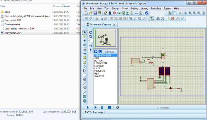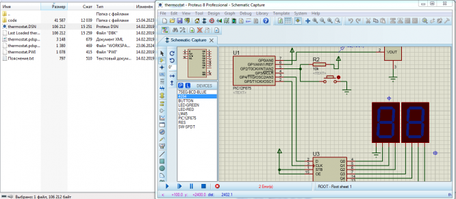Независимо от того, что делается (кнопкой ли, датчиком ли), программа прочно повисает. На протеус 8 не виснет, копятся ошибки при старте, но работает; лампа гаснет при ниже 19 градусов.