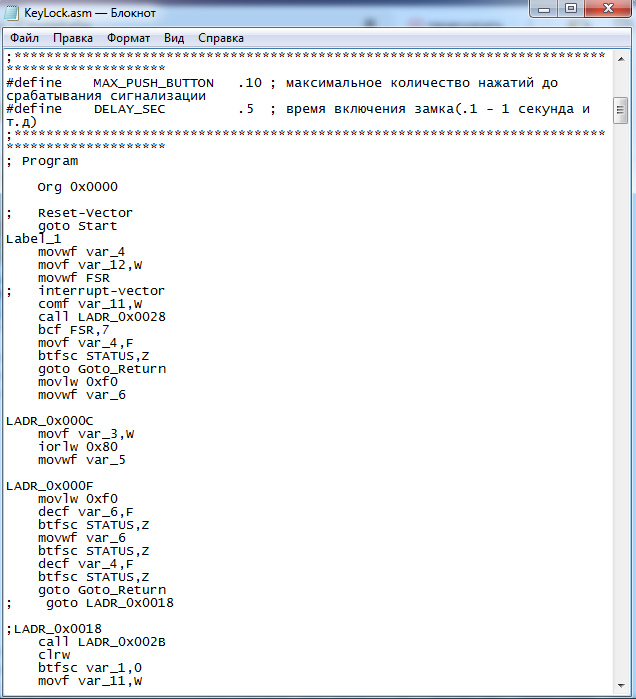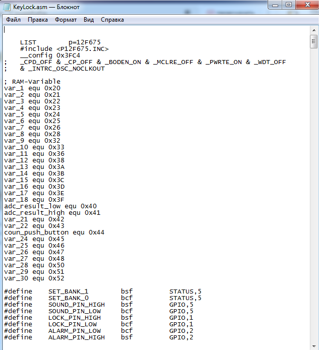 Для студентов МГТУ им. Н.Э.Баумана по предмету Аппаратные средства вычислительной техникиАСВТ Дверной Замок с сигнализацией на PIC12F675 в ProteusАСВТ Дверной Замок с сигнализацией на PIC12F675 в Proteus