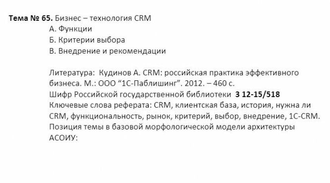 Тема № 65. Бизнес – технология CRM А. Функции Б. Критерии выбора В. Внедрение и рекомендации Литература: Кудинов А. CRM: российская практика эффективного бизнеса. М.: ООО “1С-Паблишинг”. 2012. – 460 с. Шифр Российской государственной библиотеки 3 12-15/518 Ключевые слова реферата: CRM, клиентская база, история, нужна ли CRM, функциональность, рынок, критерий, выбор, внедрение, 1С-CRM. Позиция темы в базовой морфологической модели архитектуры АСОИУ:
