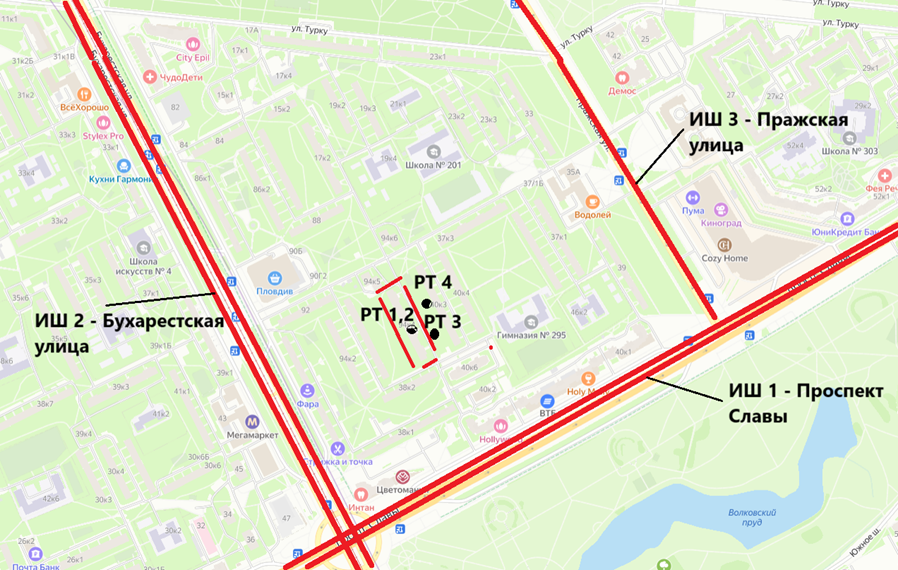 Объектом, подлежащим шумозащите является многоэтажное (9 этажей) жилое здание по адресу: Бухарестская улица, д94к4. Участок граничит: