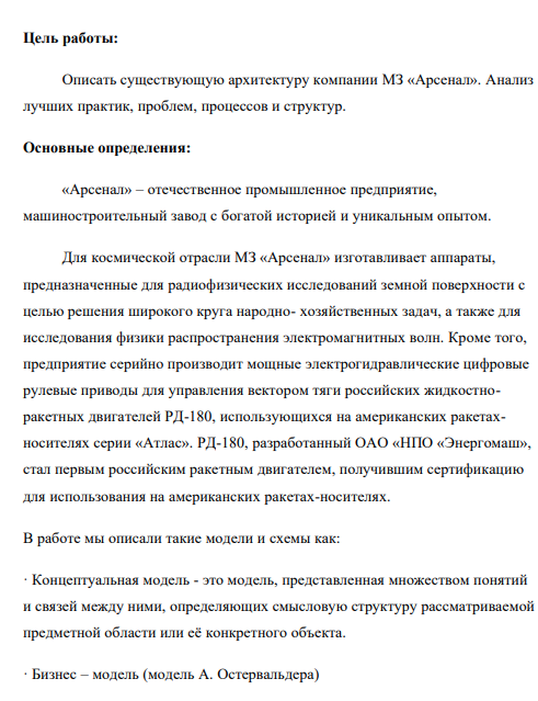 Цель работы: Описать существующую архитектуру компании МЗ «Арсенал». Анализ лучших практик, проблем, процессов и структур.