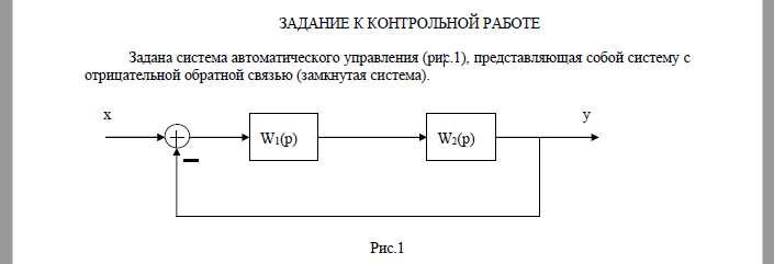 Показать/скрыть дополнительное описаниеГУАП; Автоматика и управление 1. Получить выражение для передаточной функции разомкнутой системы. 2. Получить выражение для передаточной функции замкнутой системы. 3. Определить установившееся значение выходной величины при условии, что входная величина х является ступенчатым воздействием (единичным скачком). 4. Определить статическую ошибку системы при подаче на вход единичного скачка..