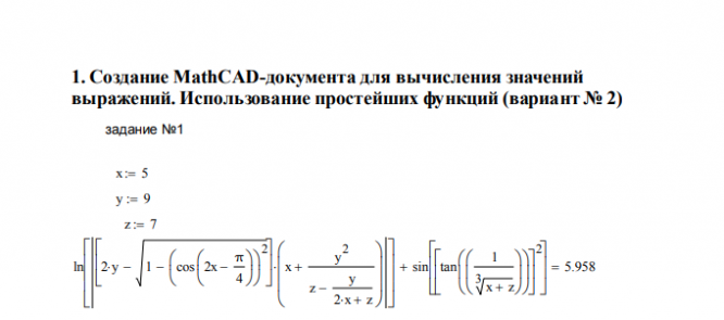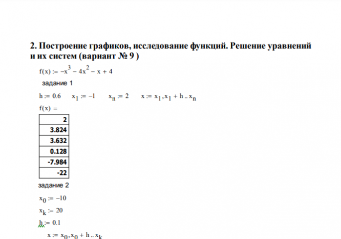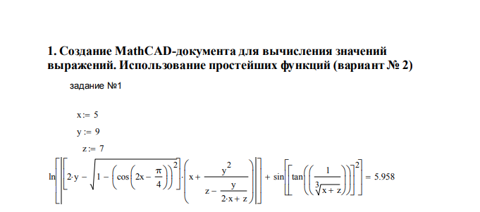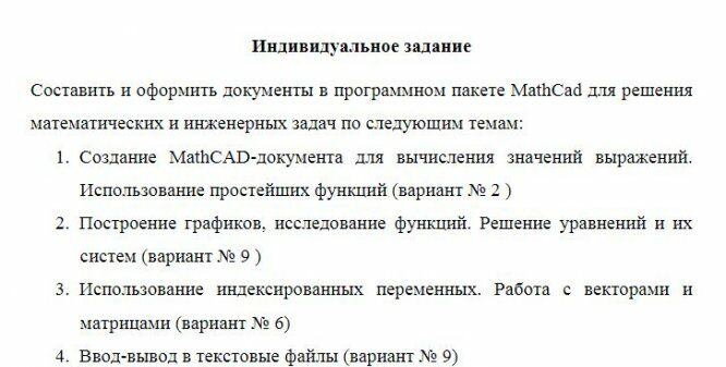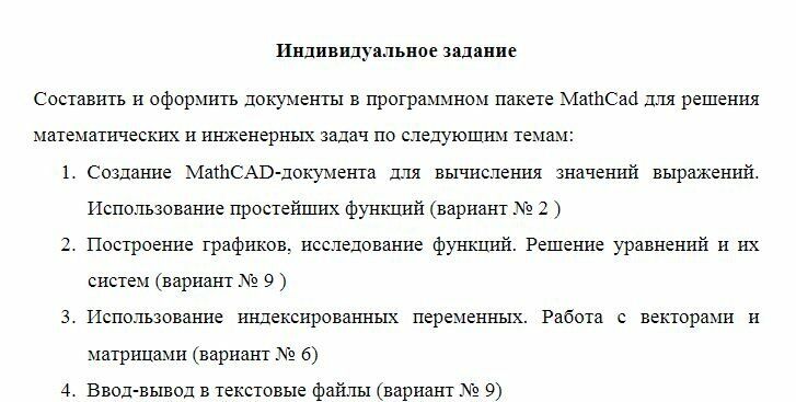 Индивидуальное заданиеСоставить и оформить документы в программном пакете MathCad для решения математических и инженерных задач по следующим темам: 1.Создание MathCAD-документа для вычисления значений выражений. Использование простейших функций (вариант No 2 ) 2.Построение графиков, исследование функций. Решение уравнений и их систем (вариант No 9 ) 3.Использование индексированных переменных. Работа с векторами и матрицами (вариант No 6) 4.Ввод-вывод в текстовые файлы (вариант No 9)