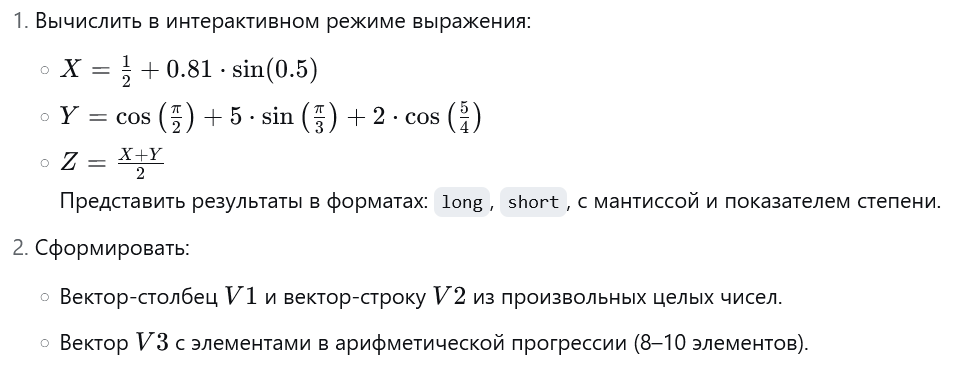 Работа посвящена освоению базовых операций в среде SciLab для выполнения инженерных расчётов. Включает вычисление выражений, работу с векторами и матрицами, а также их преобразования.