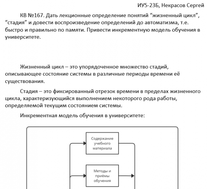 Дать лекционные определение понятий “жизненный цикл”, “стадия” и довести воспроизведение определений до автоматизма, т.е. быстро и правильно по памяти. Привести инкрементную модель обучения в университете.