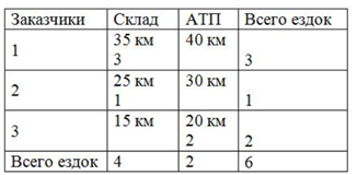 При планировании перевозок грузов маятниковыми маршрутами с центрального склада трем заказчикам решена транспортная задача. Исходные данные и результаты ее решения представлены в таблице. Определите минимальный общий пробег всех автомобилей, если расстояние от АТП до склада 15 км