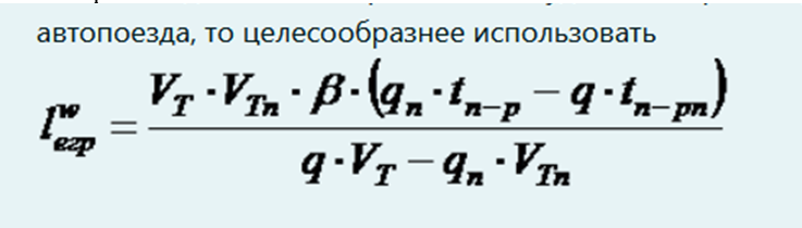 При сравнении производительности одиночного автомобиля и автопоезда на его основе по этой формуле вычислена величина (больше нуля) равноценной длины ездки. Если реальная длина ездки больше равноценной, то при неблагоприятных дорожных условиях, недостаточной мощности двигателя и при меньшем удельном простое у автопоезда, то целесообразнее использовать