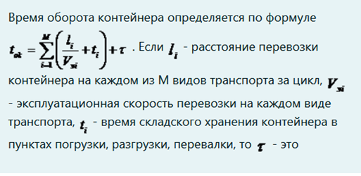 Время оборота контейнера определяется по формуле . Если li - расстояние перевозки контейнера на каждом из М видов транспорта за цикл, Vyi - эксплуатационная скорость перевозки на каждом виде транспорта, ti - время складского хранения контейнера в пунктах погрузки, разгрузки, перевалки, то τ - это