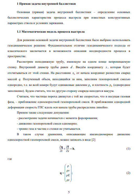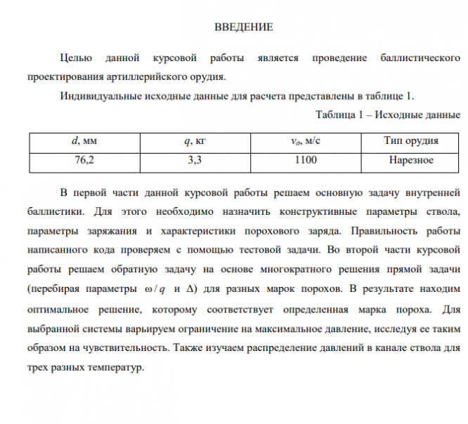 В данной курсовой работе была решена задача баллистического проектирования для известных исходных данных и для разных марок порохов. Из полученных решений был выбран порох с наилучшими результатами для данной системы. В результате были определены необходимый объем зарядной каморы, объем канала ствола, относительная масса заряда. Для этого варианта было проведено исследование на чувствительность при варьировании pmax, выбранное решение было рассмотрено для трех разных начальных температур (-40°С, +15°С, +40°С). Решение задачи баллистического проектирования – один из основных этапов разработки ствольного оружия, ведь полученные результаты являются исходными данными для многих следующих задач: проектирования ствола, лафета и т.д., в результате решения которых создается проект артиллерийского орудия.