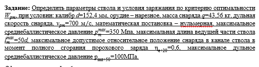 Определить параметры ствола и условия заряжания по критерию оптимальности , при условии: калибр , орудие – нарезное, масса снаряда , дульная скорость снаряда, , математическая постановка – нульмерная, максимальное среднебаллистическое давление =350 Мпа, максимальная длина ведущей части ствола =50d, максимальное допустимое относительное положение снаряда в канале ствола в момент полного сгорания порохового заряда =0,6, максимальное дульное среднебаллистическое давление =100МПа.