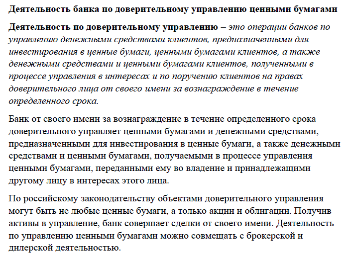 Главная » Учебные материалы » Банковское дело » Рефераты » МГТУ им. Н.Э.Баумана » 7 семестр » Деятельность банка по управлению ценными бумагами