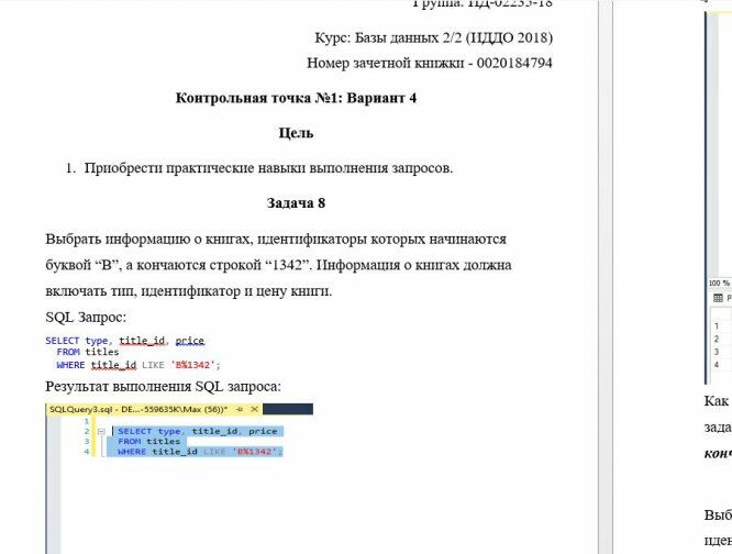 Выбрать информацию о книгах, идентификаторы которых начинаются буквой “B”, а кончаются строкой “1342”. Информация о книгах должна включать тип, идентификатор и цену книги.