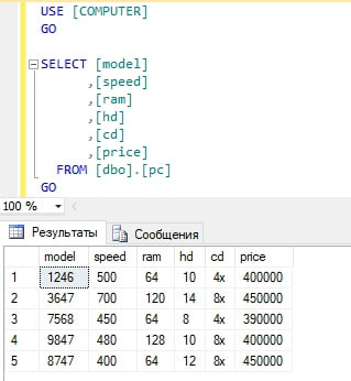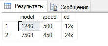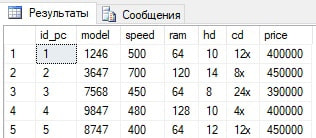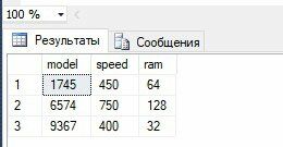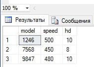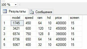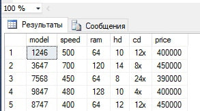С помощью оператора SELECT был выполнен запрос, где в таблице найдены номер модели, скорость и размер жесткого диска для всех ПК стоимостью менее 450000. Выберите правильный запрос для вывода результата, который представлен на рисунке ниже