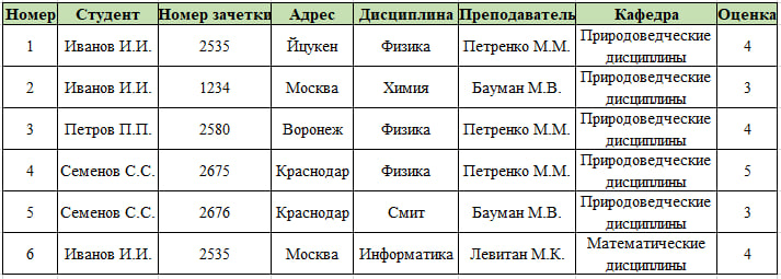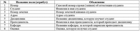 Пусть задана база данных учета учебного процесса в некотором учебном заведении, которая описывается таблицей (одной из таблиц) со следующей структурой