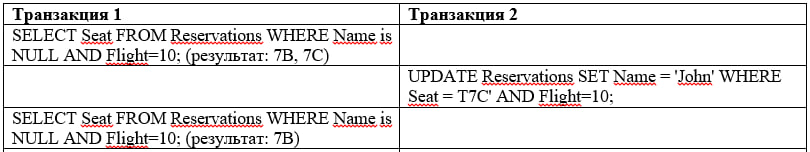 Какая аномалия транзакции приведена в примере?Представим, что между считываниями данных транзакцией 1 транзакция 2 изменила одну из строк, одно и то же выражение дало разные результаты – во второй раз получено меньшее число свободных мест.