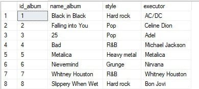 Схема БД (magazin) состоит из четырех таблиц: Salesman (id_salesman, name_salesman); Buyer (id_buyer, name_ buyer); Album (id_album, name_album, style, executor); Sale (id_sale, salesman, buyer, album, data_sale, price). В таблице Album для каждого альбома, однозначно определяемого уникальным кодом – id_album (первичный ключ к таблице Album), указаны имя альбома – name_album, жанр – style, а также исполнитель альбома – executor.
