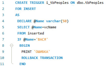 В данном примере создается триггер на добавление записей. Внутри триггера объявлется переменная @Name типа varchar длиной в 50 символов. В эту переменную сохраняется содержимое поля "vcName" таблицы inserted. Далее проверяется, если имя равно Вася, то сообщается ошибка и откатывается транзакция. Иначе, строка будет удачно добавлена.