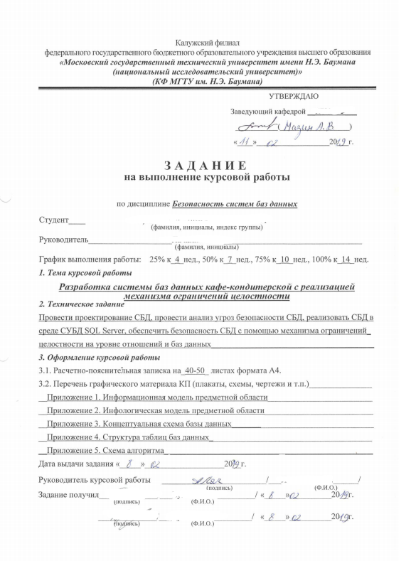 Для студентов МГТУ им. Н.Э.Баумана по предмету Базы данныхРазработка системы баз данных кафе-кондитерской с реализацией механизма ограничений целостностиРазработка системы баз данных кафе-кондитерской с реализацией механизма ограничений целостности