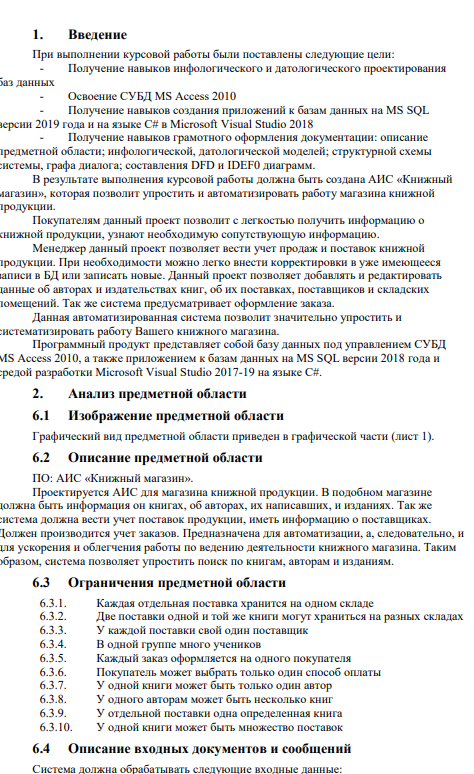 При выполнении курсовой работы были поставлены следующие цели: - Получение навыков инфологического и датологического проектирования баз данных - Освоение СУБД MS Access 2010 - Получение навыков создания приложений к базам данных на MS SQL версии 2019 года и на языке С# в Microsoft Visual Studio 2018 - Получение навыков грамотного оформления документации: описание предметной области; инфологической, датологической моделей; структурной схемы системы, графа диалога; составления DFD и IDEF0 диаграмм. В результате выполнения курсовой работы должна быть создана АИС «Книжный магазин», которая позволит упростить и автоматизировать работу магазина книжной продукции. Покупателям данный проект позволит с легкостью получить информацию о книжной продукции, узнают необходимую сопутствующую информацию. Менеджер данный проект позволяет вести учет продаж и поставок книжной продукции. При необходимости можно легко внести корректировки в уже имеющееся записи в БД или записать новые. Данный проект позволяет добавлять и редактировать данные об авторах и издательствах книг, об их поставках, поставщиков и складских помещений. Так же система предусматривает оформление заказа. Данная автоматизированная система позволит значительно упростить и систематизировать работу Вашего книжного магазина. Программный продукт представляет собой базу данных под управлением СУБД MS Access 2010, а также приложением к базам данных на MS SQL версии 2018 года и средой разработки Microsoft Visual Studio 2017-19 на языке С#.