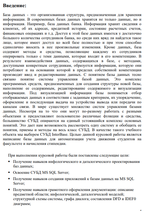 База данных - это организованная структура, предназначенная для хранения информации. В современных базах данных хранятся не только данные, но и информация. Например, база данных банка. Информация хранит сведения о клиентах, об их адресах, кредитной истории, состояние расчетных счетов, финансовых операциях и т.д. Доступ к этой базе данных имеется у достаточно большого количества сотрудников банка, но среди них вряд ли найдется такое лицо, которое имеет доступ ко всей базе полностью и при этом способно единолично вносить в нее произвольные изменения. Кроме данных, база содержит методы и средства, позволяющие каждому из сотрудников оперировать только с теми данными, которые входят в его компетенцию. В результате взаимодействия данных, содержащихся в базе, с методами, доступными конкретным сотрудникам, образуется информация, которую они потребляют и на основании которой в пределах собственной компетенции производят ввод и редактирование данных. С понятием базы данных тесно связано понятие системы управления базой данных. Это комплекс программных средств, предназначенных для создания структуры новой базы, наполнение ее содержимым, редактирование содержимого и визуализации информации. Под визуализацией информации базы понимается отбор отображаемых данных в соответствии с заданным критерием, их упорядочение, оформление и последующая выдача на устройства вывода или передачи по каналам связи. В мире существует множество систем управления базами данных. Несмотря на то что они могут по-разному работать с разными объектами и предоставляют пользователю различные функции и средства, большинство СУБД опираются на единый устоявшийся комплекс основных понятий. Это дает нам возможность рассмотреть одну систему и обобщить ее понятия, приемы и методы на весь класс СУБД. В качестве такого учебного объекта мы выберем СУБД InterBase. Целью данной курсовой работы является написание базы данных для автоматизации учета движения студентов на факультете и начисления стипендии.