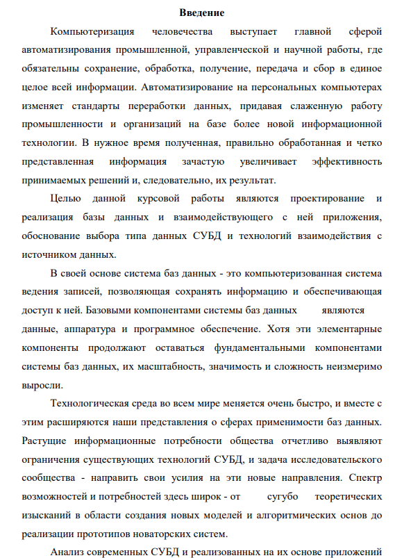 Целью данной курсовой работы являются проектирование и реализация базы данных и взаимодействующего с ней приложения, обоснование выбора типа данных СУБД и технологий взаимодействия с источником данных.