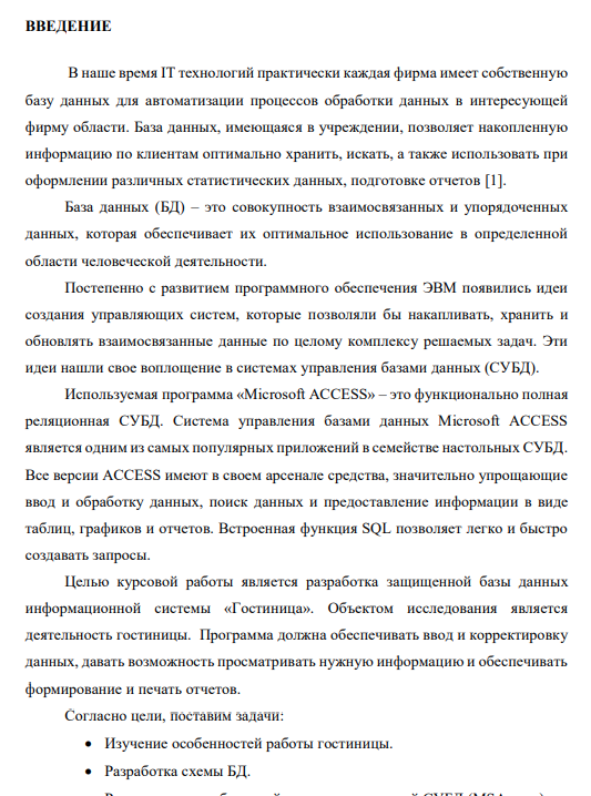 Целью курсовой работы является разработка защищенной базы данных информационной системы «Гостиница». Объектом исследования является деятельность гостиницы. Программа должна обеспечивать ввод и корректировку данных, давать возможность просматривать нужную информацию и обеспечивать формирование и печать отчетов. Согласно цели, поставим задачи: Изучение особенностей работы гостиницы. Разработка схемы БД. Реализация разработанной схемы в конкретной СУБД (MSAccess). 4 Создание форм для ввода данных, отчетов, запросов. Автоматизация работы с созданной БД.