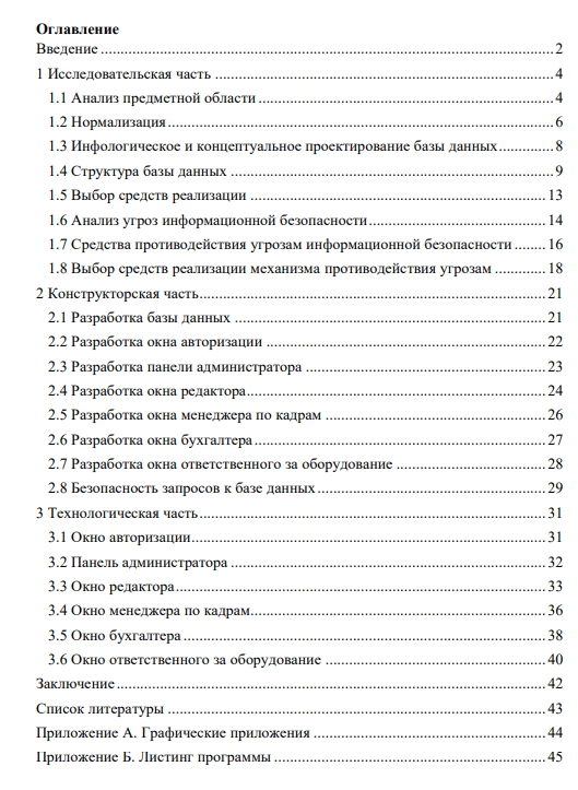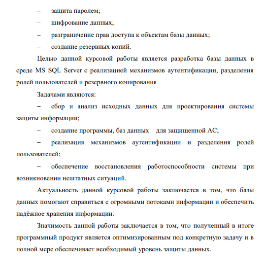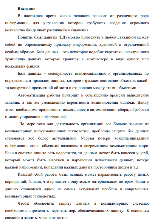База данных – совокупность взаимосвязанных и организованных по определенным правилам данных, которое отражает состояние объектов какойто конкретной предметной области и отношения между этими объектами. Автоматизация работы приводит к сокращению времени выполнения задания, а так же уменьшению вероятности возникновения ошибки. Ввиду этого необходимо приложение, помогающее в автоматизации сбора, обработки и манипулирования информацией. По мере того как деятельность организаций всё больше зависит от компьютерных информационных технологий, проблемы защиты баз данных становятся всё более актуальными. Угрозы потери конфиденциальной информации стали обычным явлением в современном компьютерном мире. Если в системе защите есть недостатки, то данным может быть нанесен ущерб, который может быть выражен в нарушении целостности данных, потере важной информации, попадании важных данных посторонним лицам и т.д.